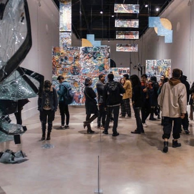 La obra se basa en crear un dialogo con el espectador, cuestionar el espacio que habitamos. Los modulos colgantes también crean un juego visual, desde un punto de vista los mosiacos se juntan pese a diferencia de tamaños y posiciones para crear una sola imagen. Del otro lado de los modulos para representarla calle, invité a alrededor de 15 artistas urbanos para intervenir los paneles. Abriendo asi la posibilidad dentro del museo para que las paredes y la obra expuesta se siga intervinendo.