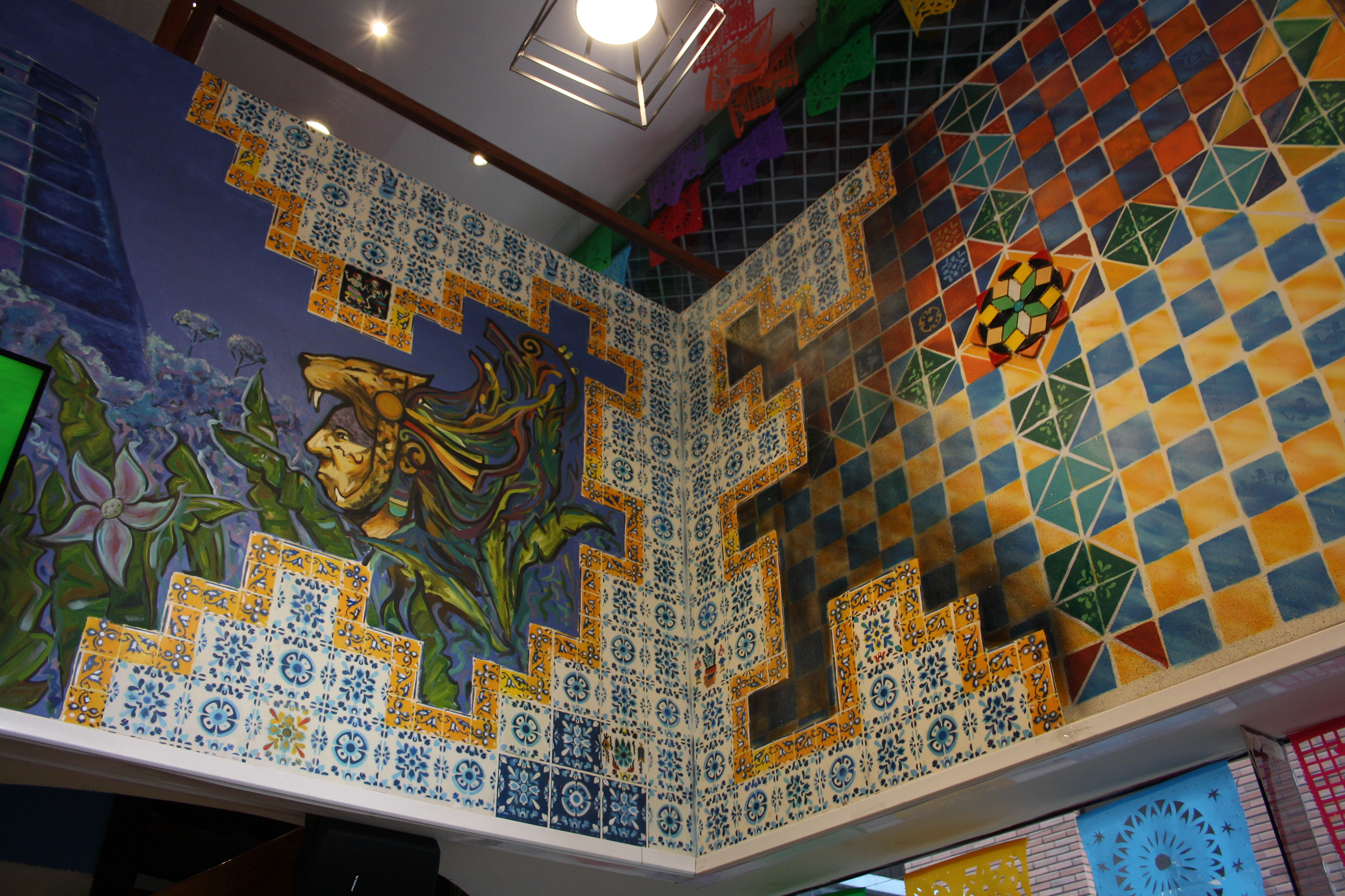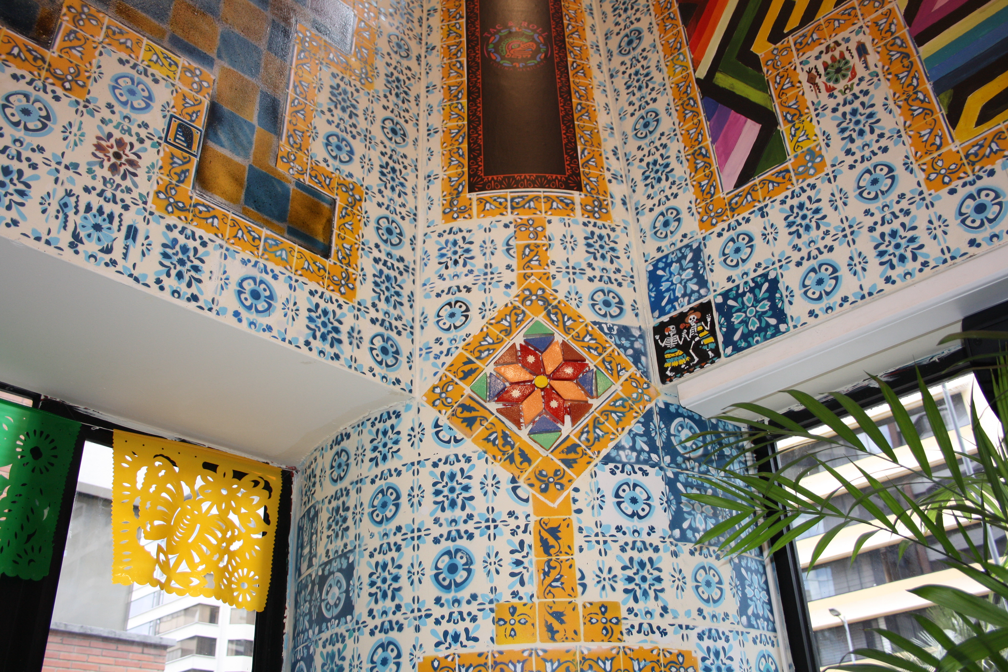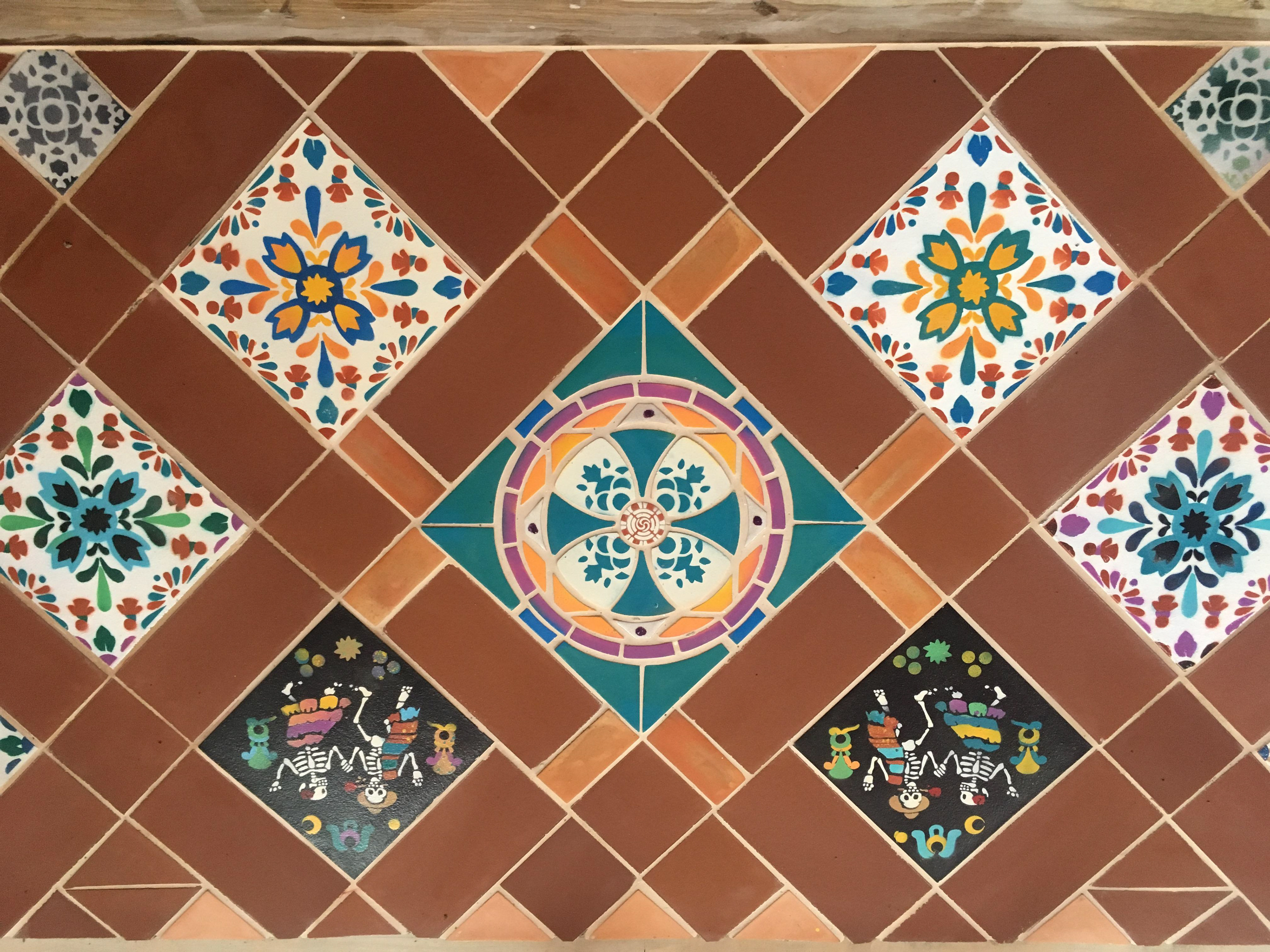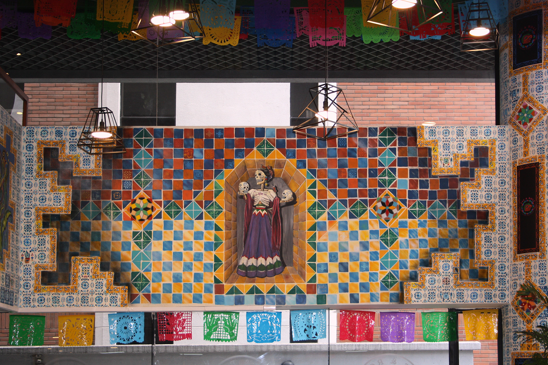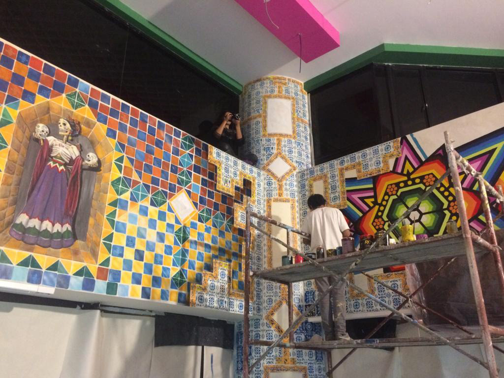 Pinturas y mezcla de mosaicos con cerámicas Para restaurante con temática mexicana. En esta propuesta los mosaicos son únicos y personalizados para ser un elemento fundamental en la identidad del restaurante.