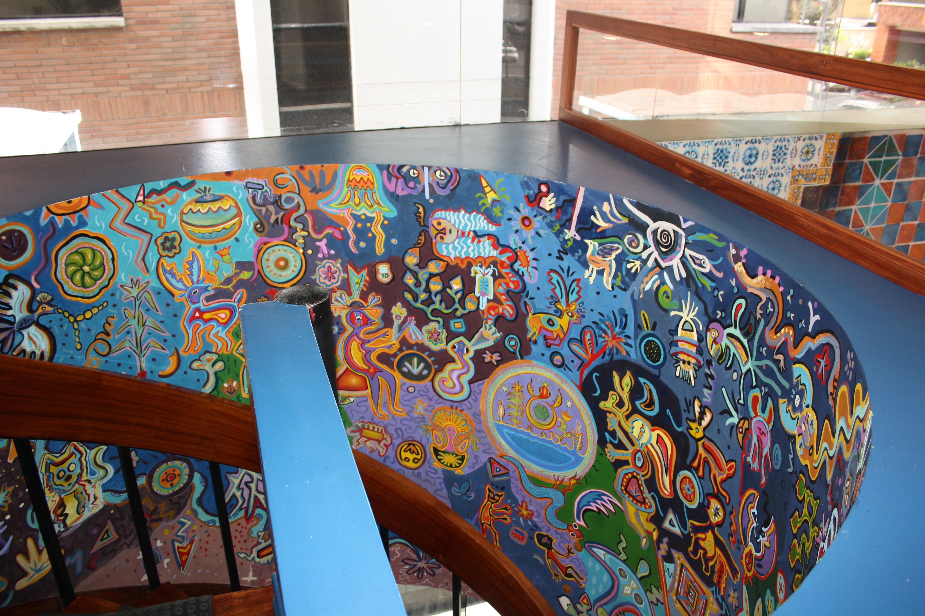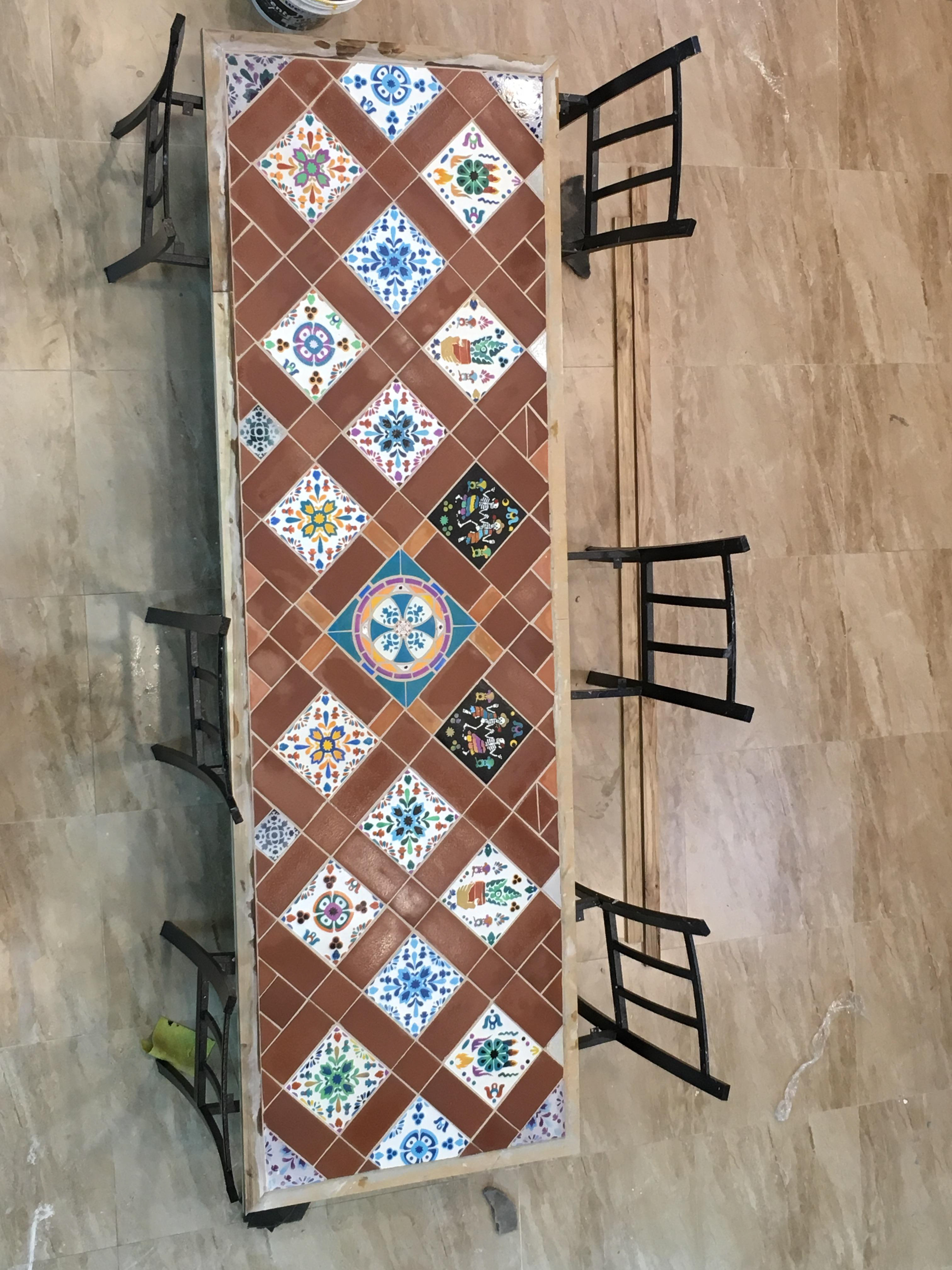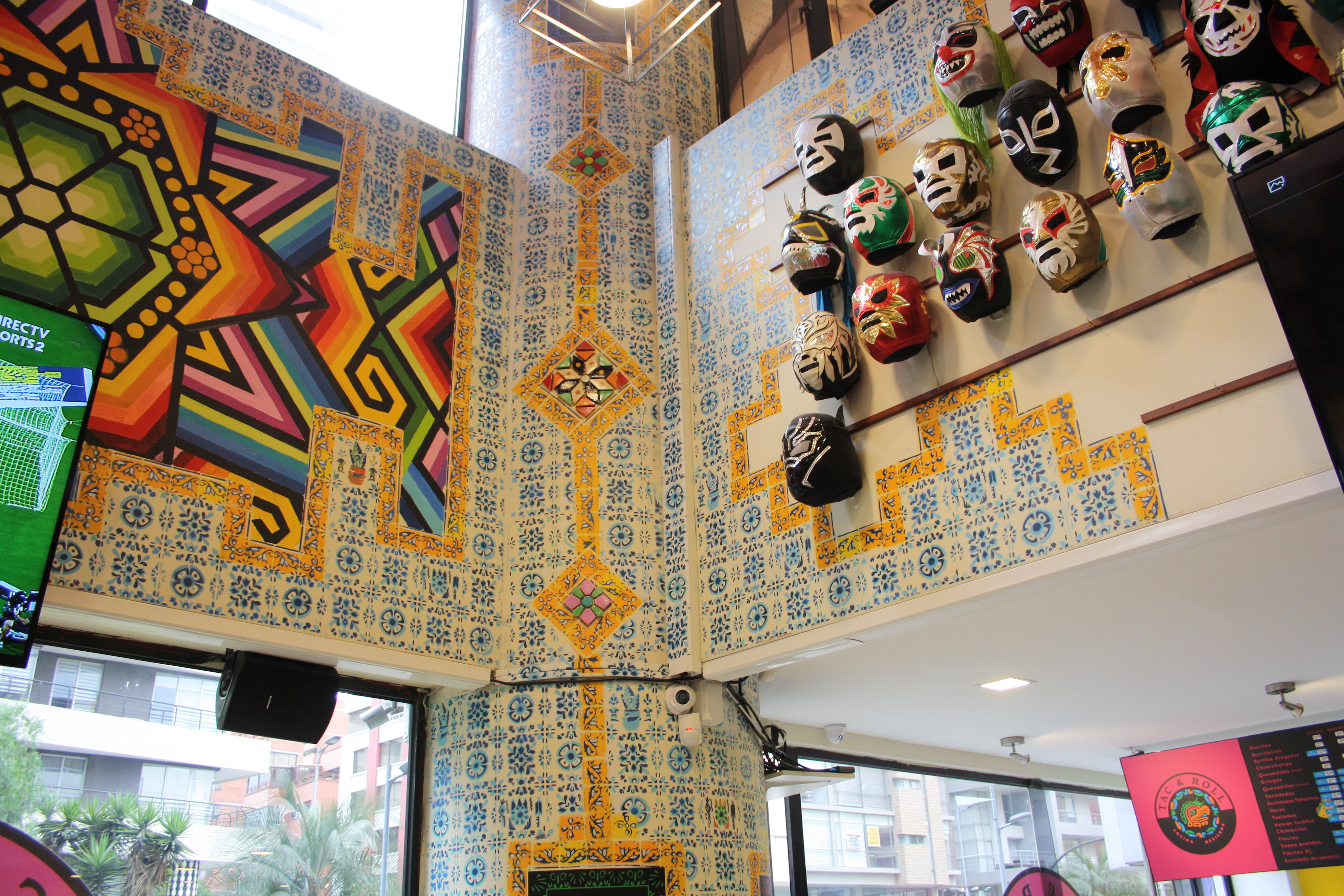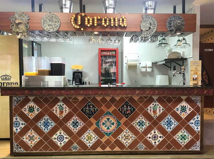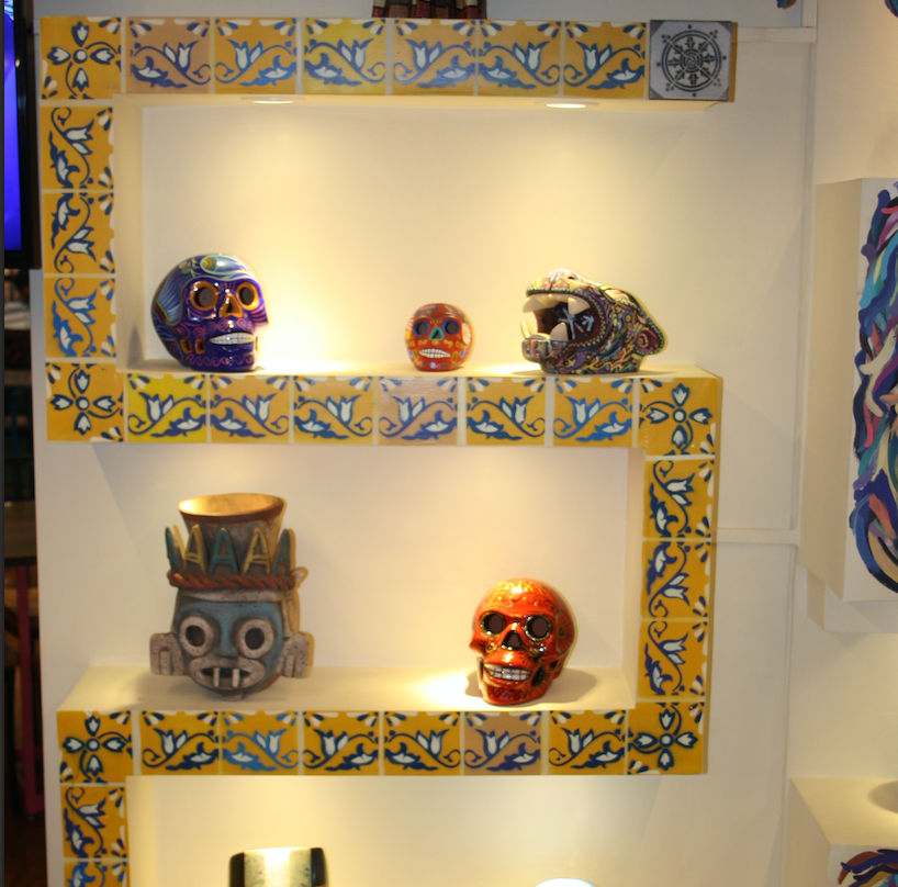 Pinturas y mezcla de mosaicos con cerámicas Para restaurante con temática mexicana. En esta propuesta los mosaicos son únicos y personalizados para ser un elemento fundamental en la identidad del restaurante.